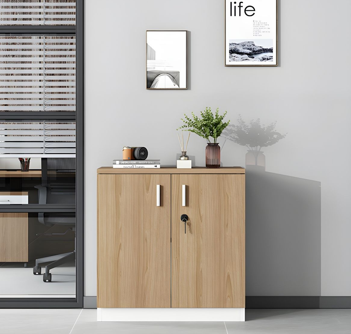 The 2 Door Wooden Office Storage Cabinet features smooth-operating doors with sturdy handles, ensuring ease of access and secure storage. Its stable frame prevents wobbling, providing reliable support for files, office equipment, or decorative items placed on top. The cabinet’s sleek, minimalist design not only enhances organization but also adds a touch of sophistication to your office setup.