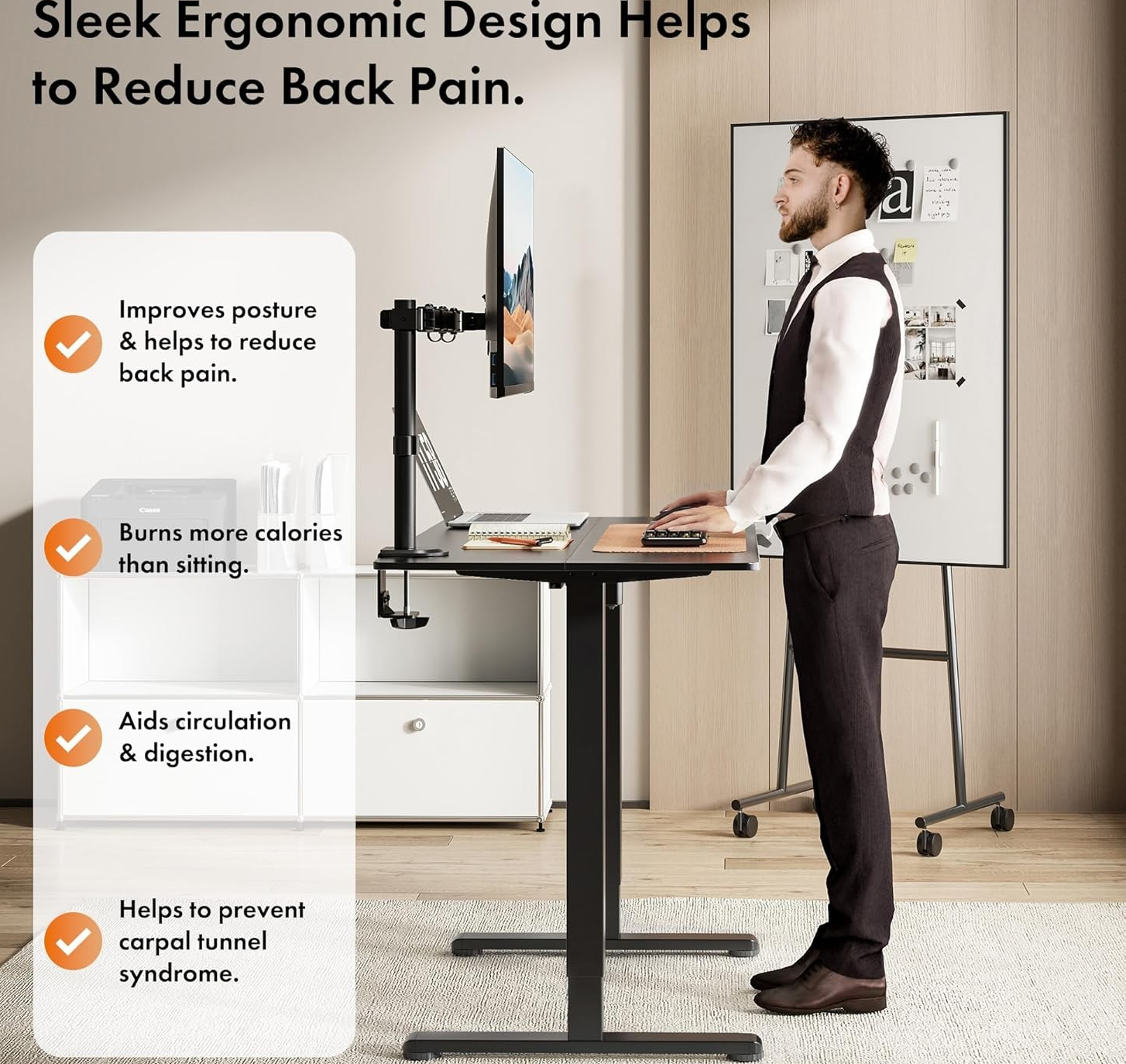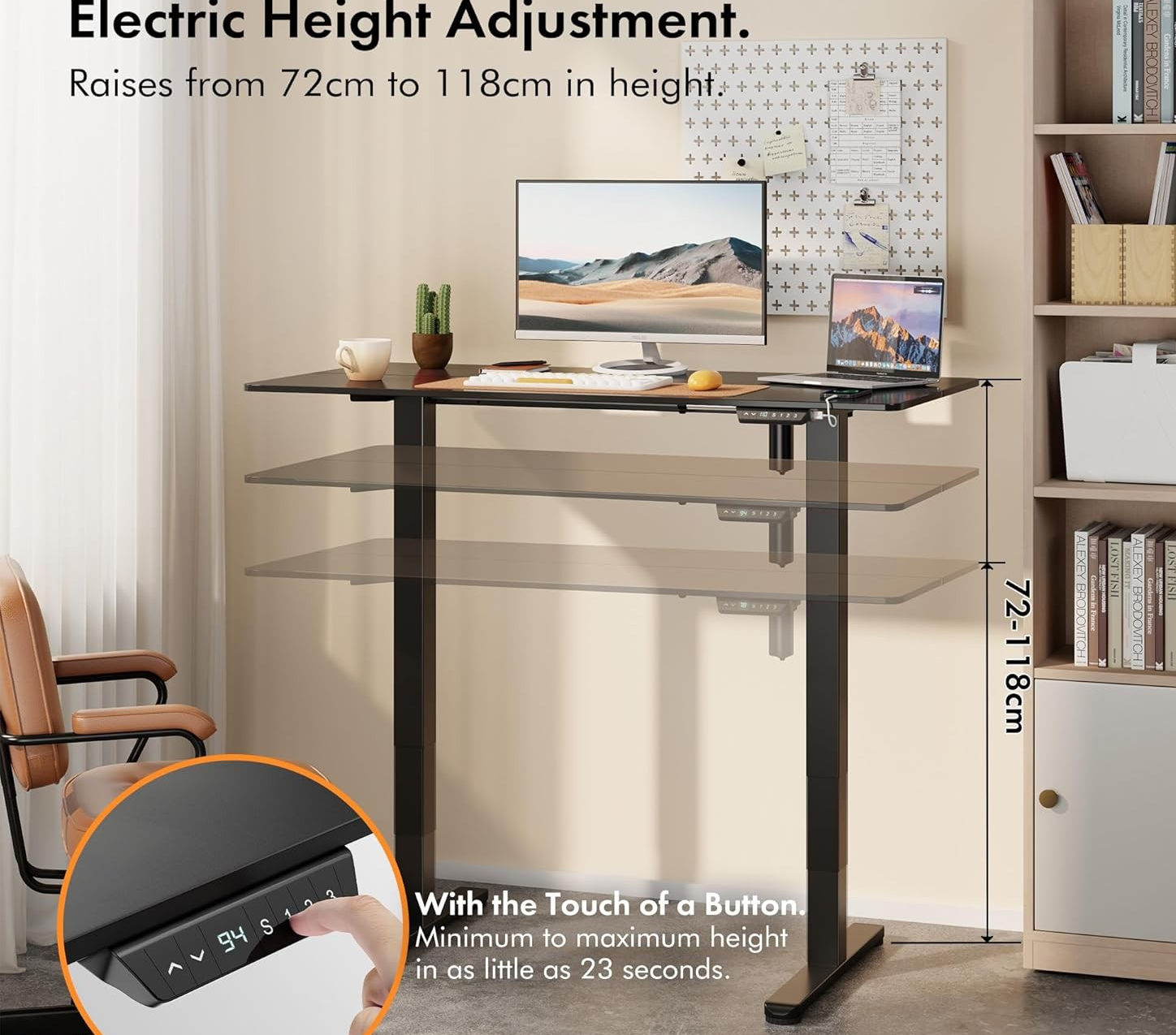 - Ergonomic Design: Easily switch between sitting and standing positions with the touch of a button, promoting better health, posture, and energy levels throughout your workday.