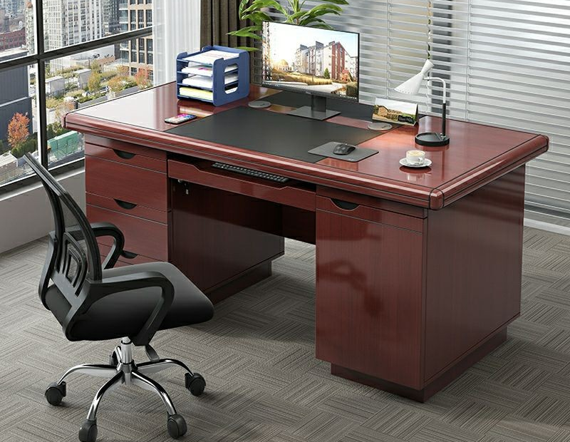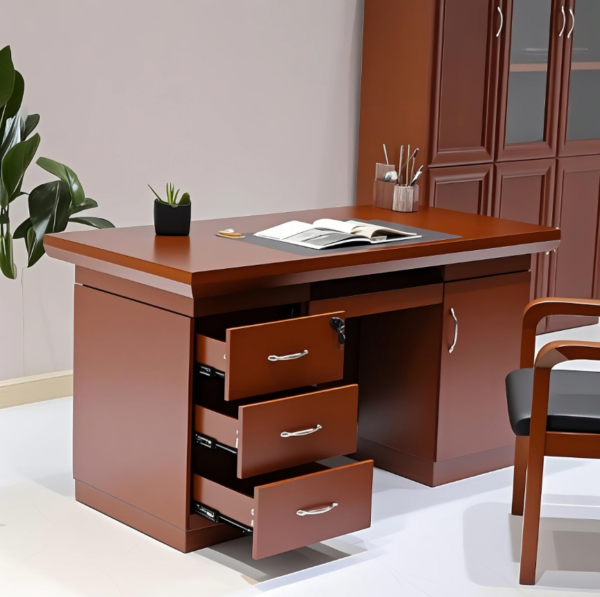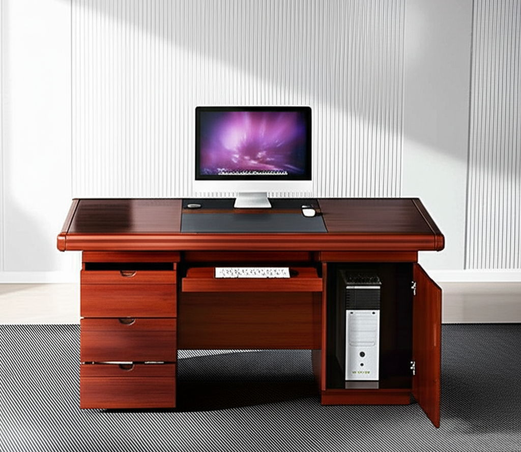 The desk’s sturdy construction ensures long-lasting durability, capable of supporting daily use in busy offices. Its smooth tabletop accommodates laptops, monitors, and paperwork, while drawers and storage compartments offer convenient access to files, stationery, and personal items. The ergonomic design allows for comfortable seating and efficient workflow, helping you stay productive throughout the day. The deep mahogany finish not only adds sophistication but also resists scratches and stains, maintaining the desk’s elegant appearance over time.
