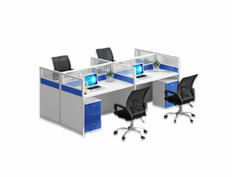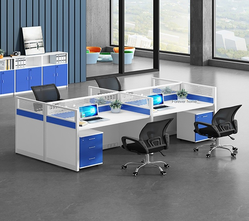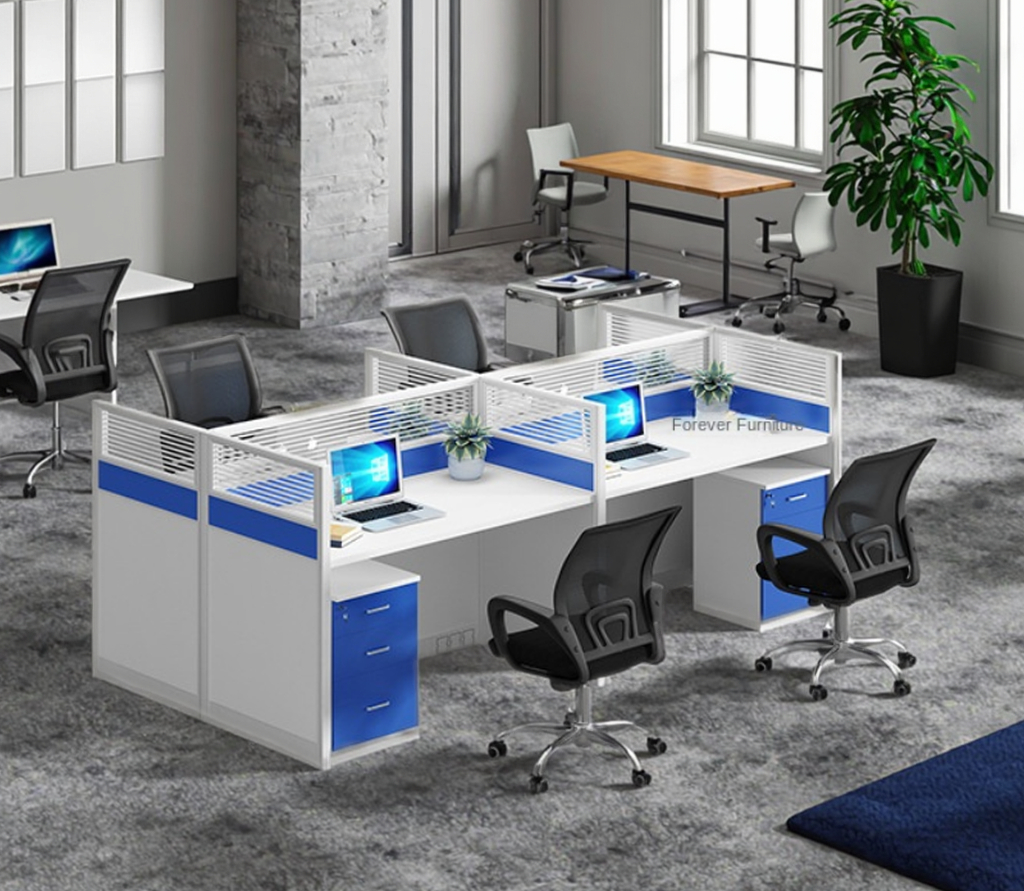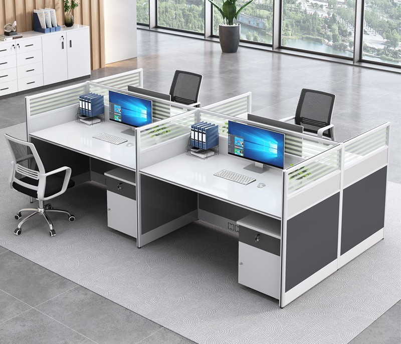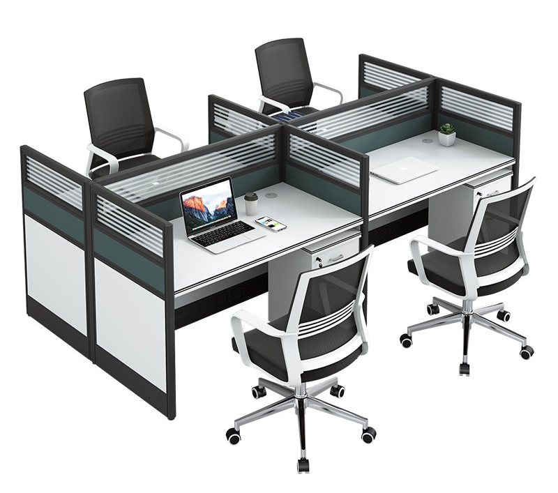 Each section of the 4-way workstation features generous desktop space, allowing employees to comfortably handle computers, documents, and office accessories. The workstation also includes partition panels that ensure privacy and reduce distractions, promoting a focused work environment.