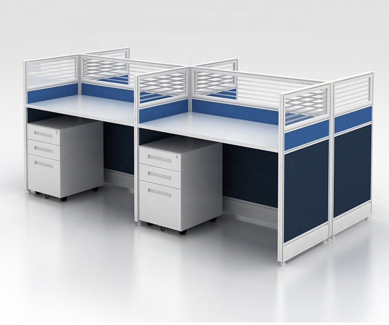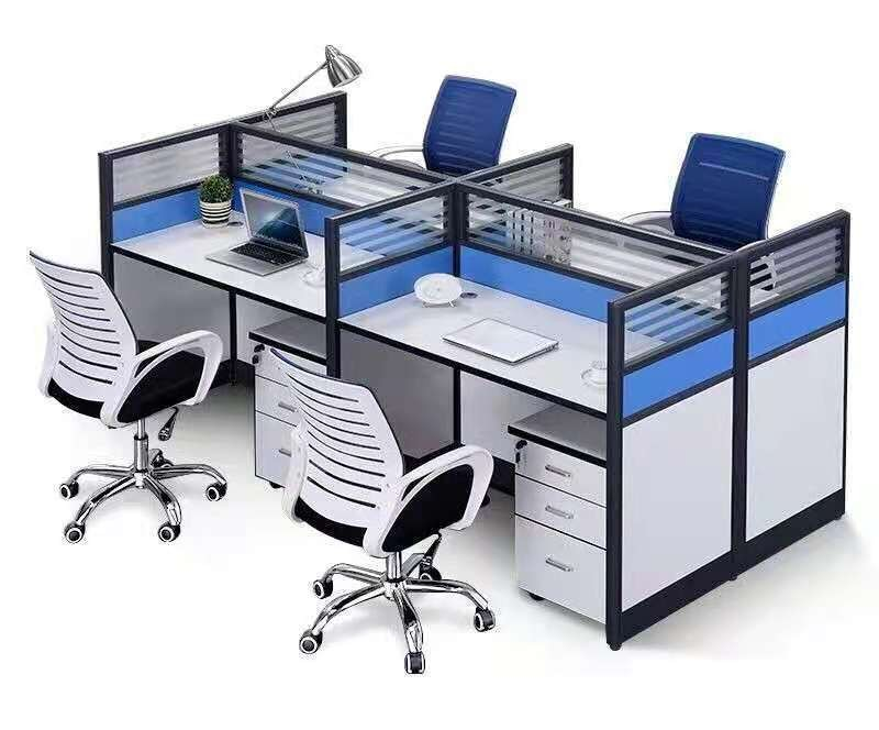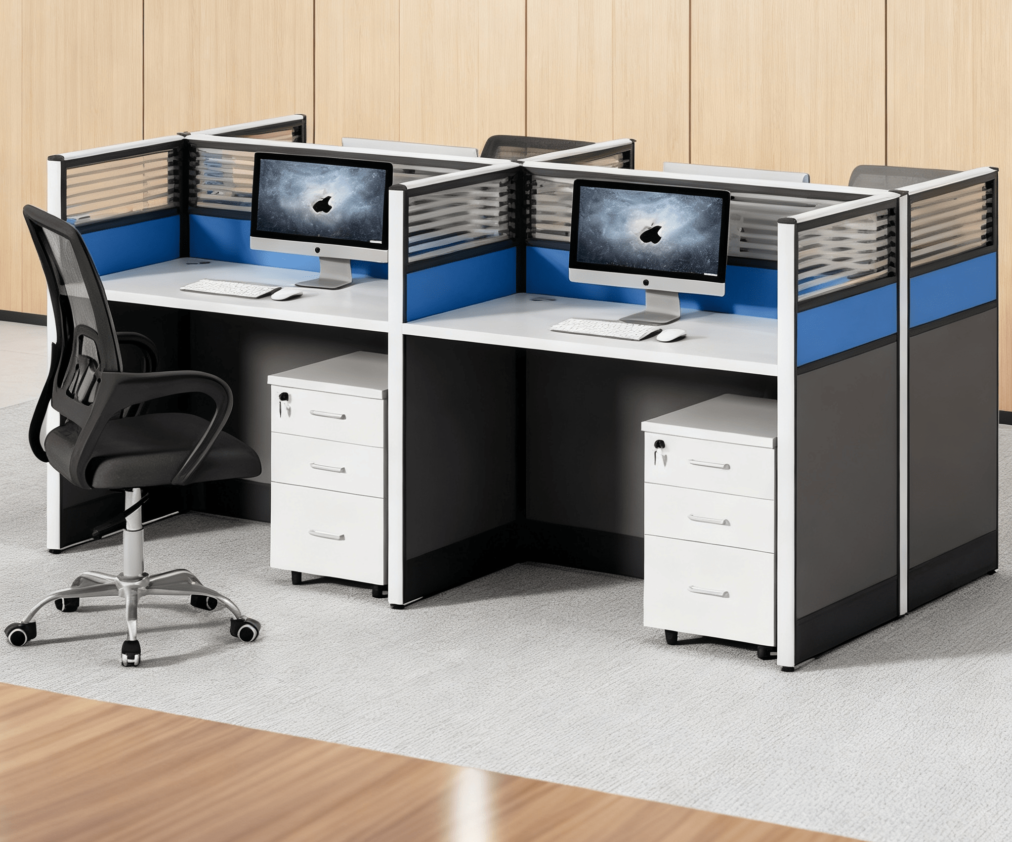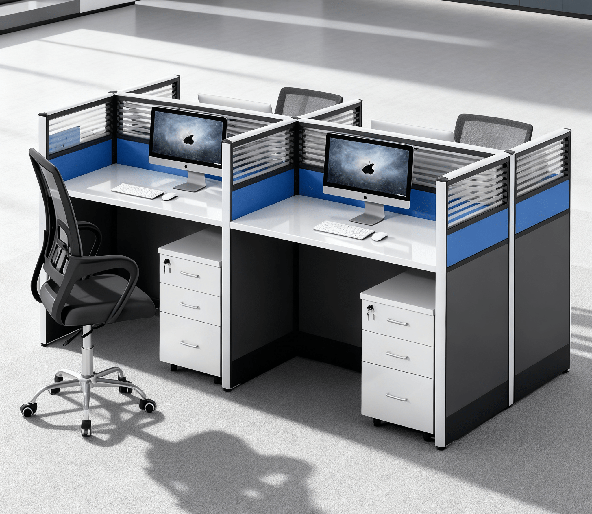 Each section of the 4-way workstation features generous desktop space, allowing employees to comfortably handle computers, documents, and office accessories. The workstation also includes partition panels that ensure privacy and reduce distractions, promoting a focused work environment.