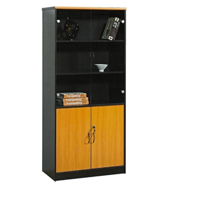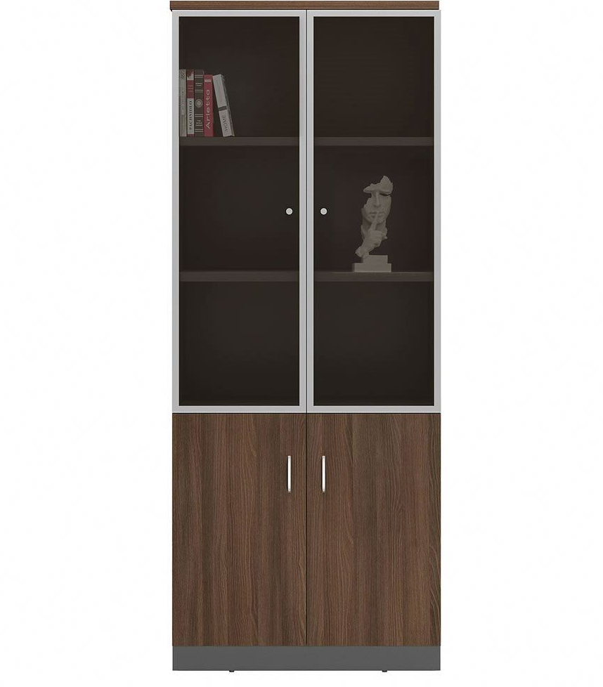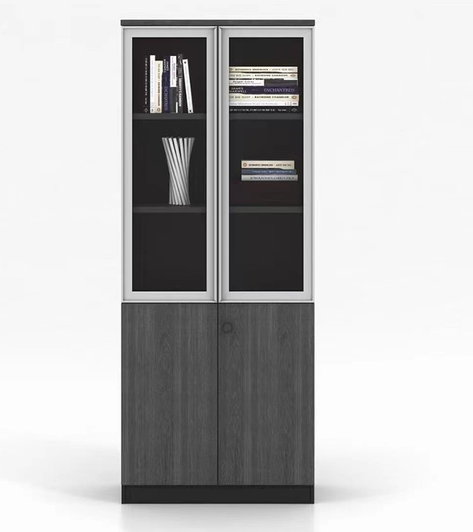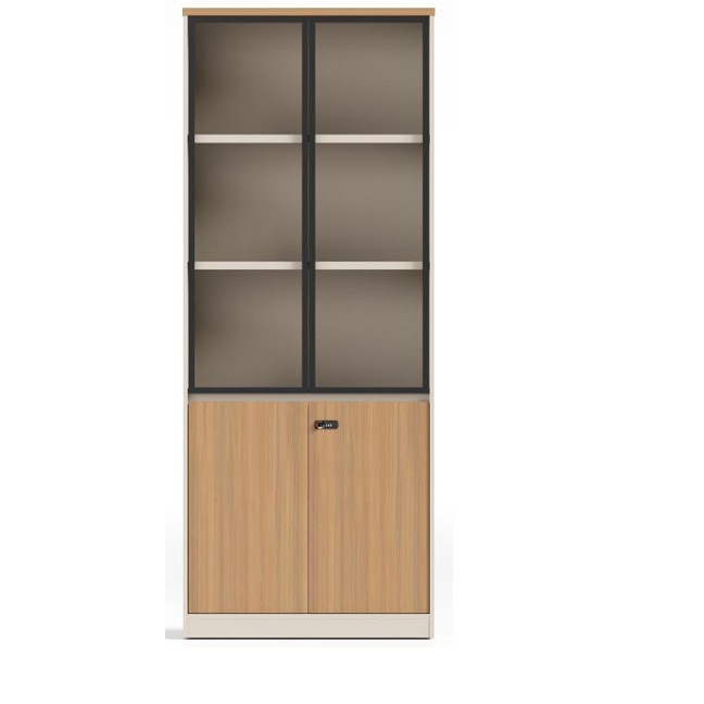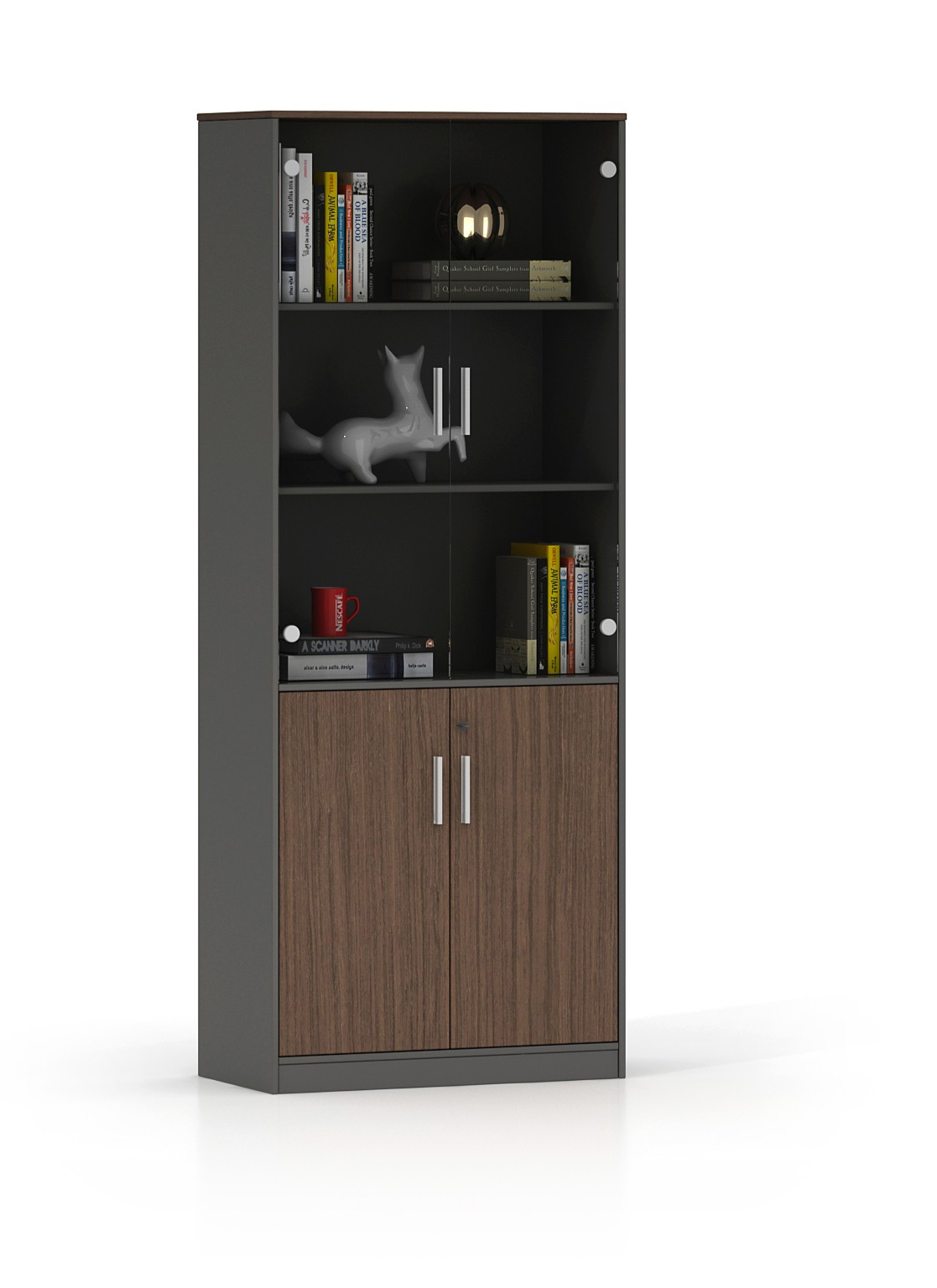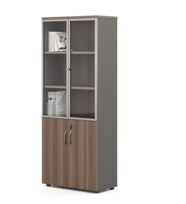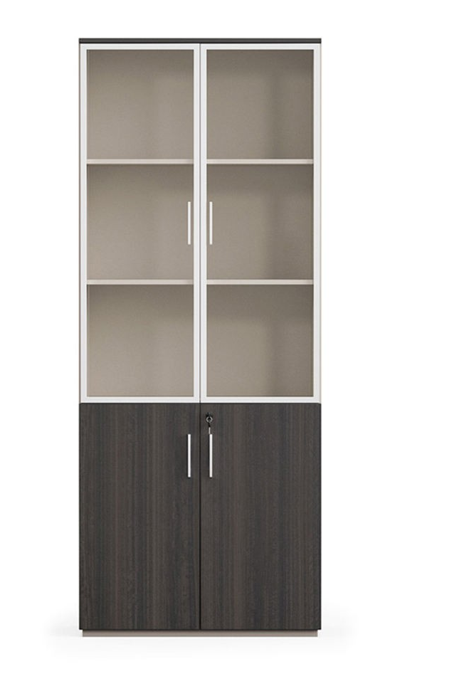 The upper section features glass-panel doors—perfect for displaying awards, books, or neatly arranged files—while the lower section has solid doors to discreetly store documents, supplies, or equipment. -