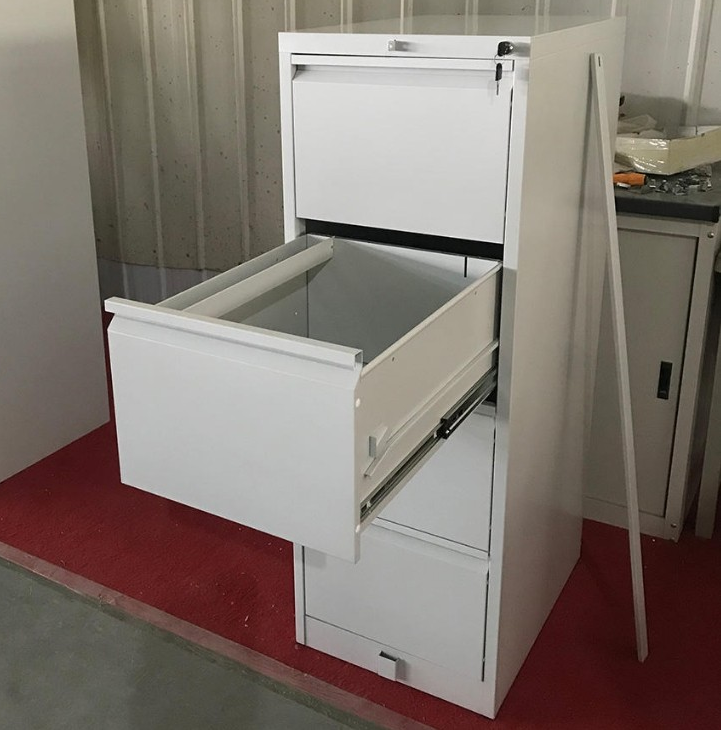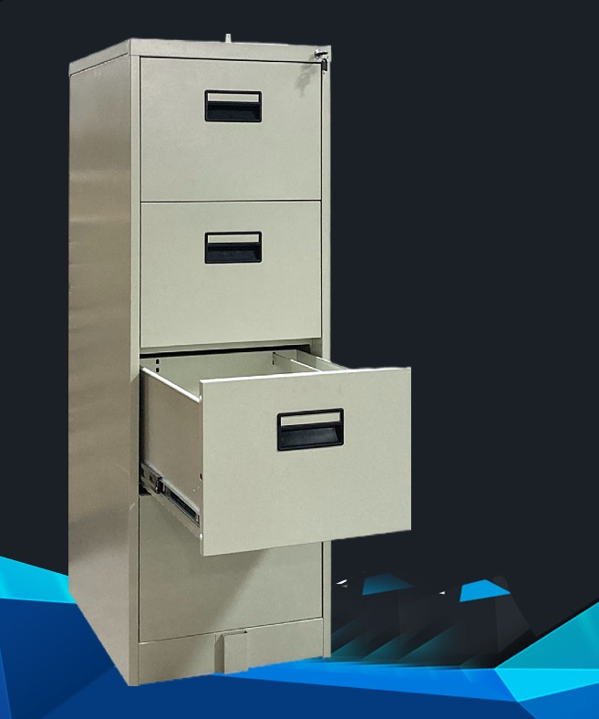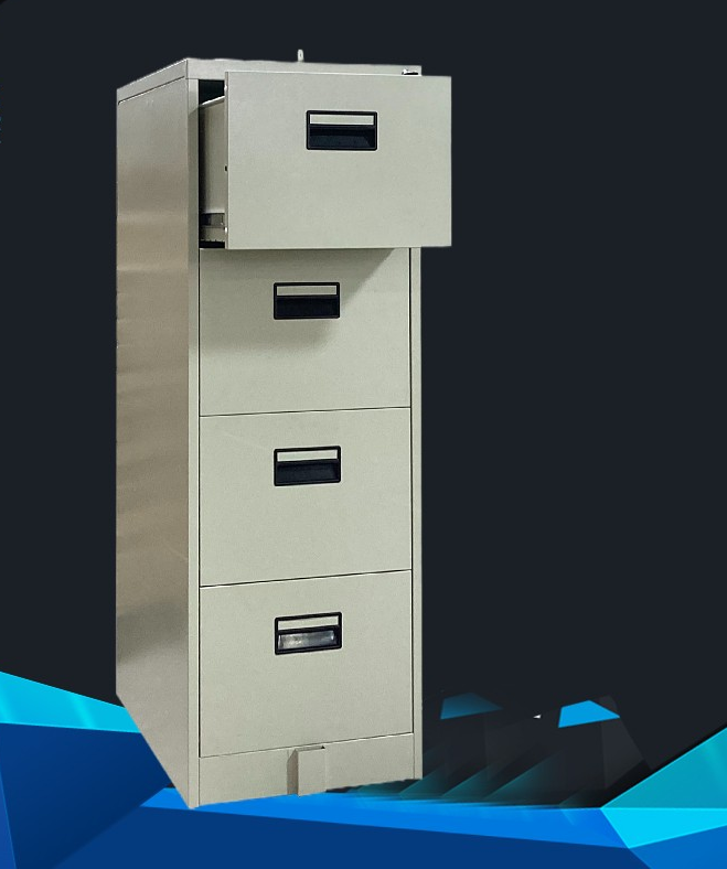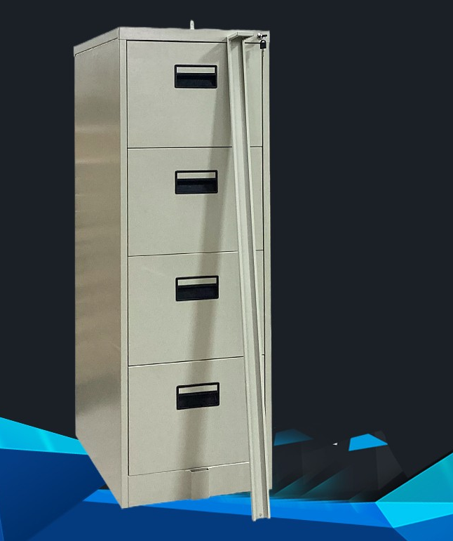 A sturdy steel cabinet featuring full-extension drawers with ball-bearing slides, anti-tilt design, and a locking mechanism for enhanced security. -