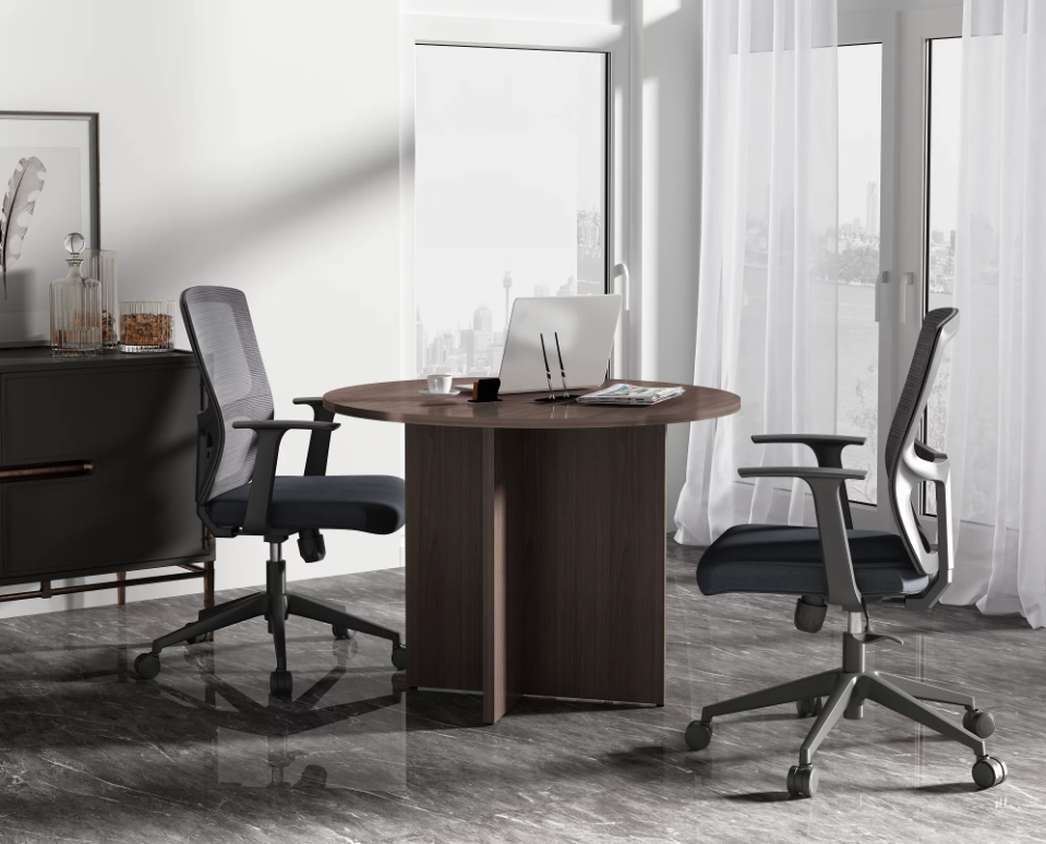 The wooden mini conference table features a smooth, polished tabletop that is both elegant and functional. Its durable surface resists scratches, stains, and everyday wear, ensuring it retains its refined appearance even with frequent use. The round shape promotes a balanced and collaborative environment, allowing participants to interact naturally while maintaining personal space.